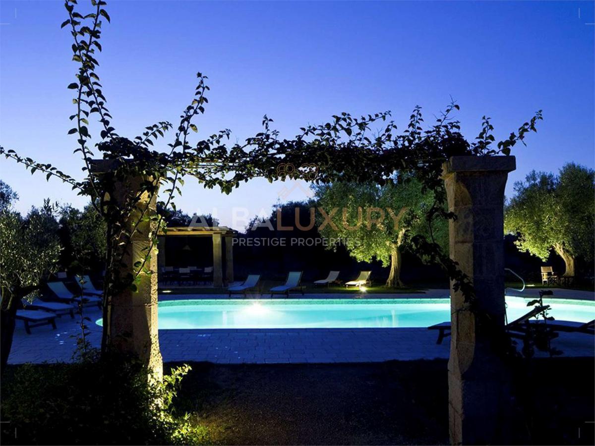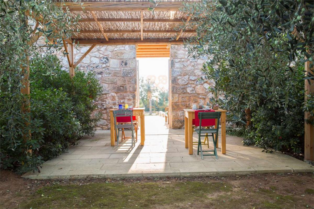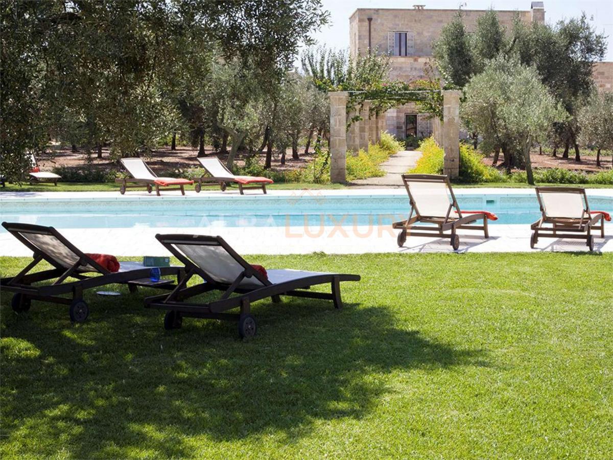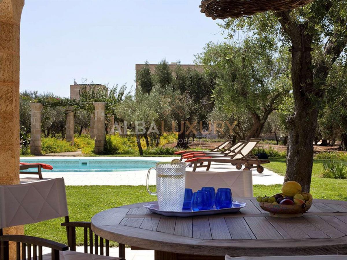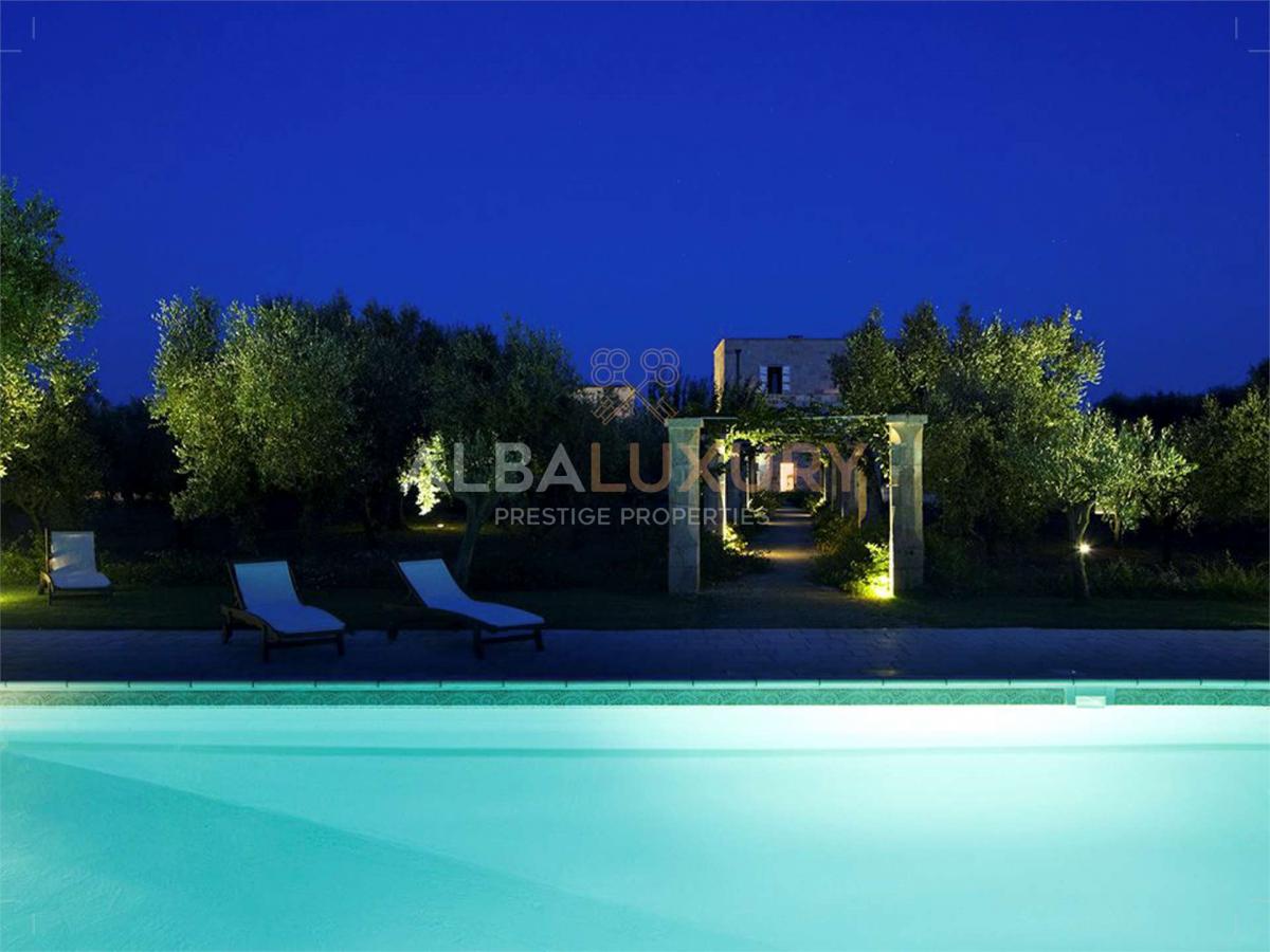 Enchanting 17th century farmhouse, renovated in 2008 with a relaxing and classy atmosphere.^The structure consists of buildings constructed from local stone with 10 elegant and functional bedrooms complete with heating and private bathroom, as well as two kitchens with spacious lounges.^Everything is surrounded by olive groves, prickly pears, citrus fruits and various kinds of fruit.^There is a large garden bordering the olive grove as well as a splendid swimming pool with two bathrooms and a storage room.^The Masseria is strategically located for exploring the area and reaching the Adriatic and Ionian coasts.^The Salento extends in the southern part of Apulia and its easternmost point coincides with the Capo d'Otranto, the point where the waters of the Ionian and Adriatic Seas come together; this is an enchanting land that will surely surprise you with its marvellous landscapes, its white beaches characterised by the so-called 'dunes', and the numerous breathtaking cliffs, full of caves, overlooking a crystal-clear sea. ^,