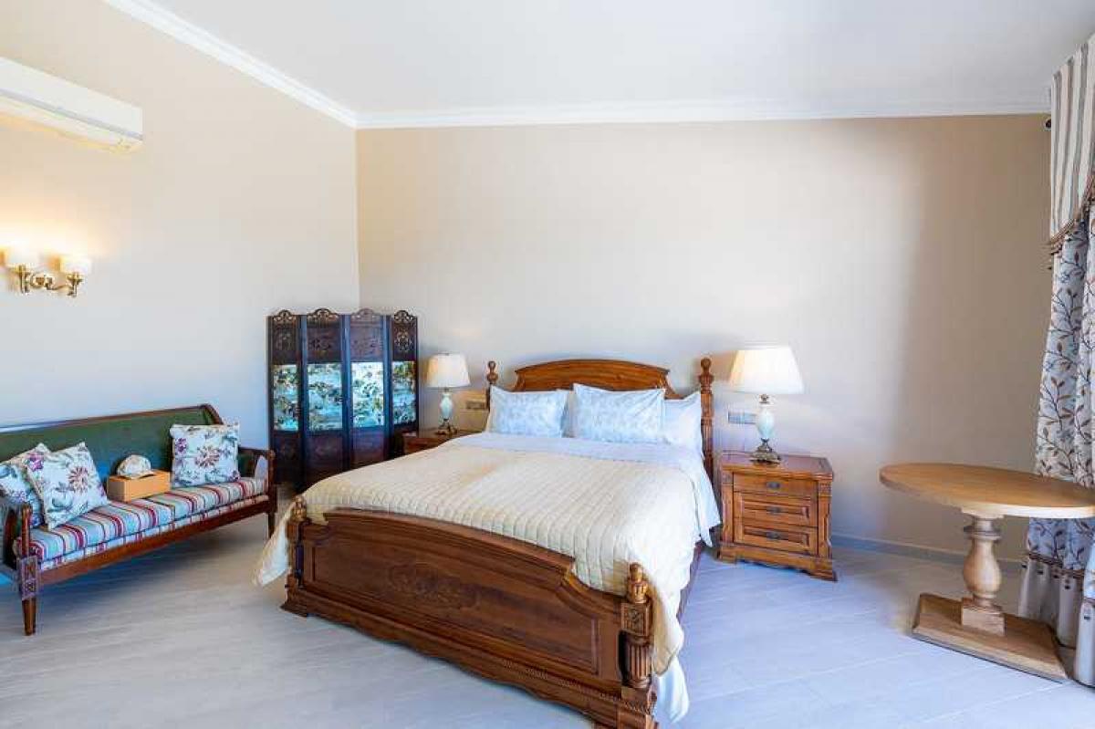 Choose between walking upstairs or using the indoor elevator to reach the upper floor, where luxurious bedrooms provide a tranquil sanctuary. These generously sized rooms feature classic decor, en-suite bathrooms, and private terraces offering sweeping views of the sea.