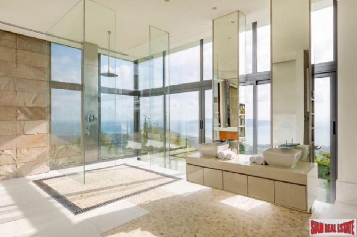 From the entry of this luxury villa in Ko Samui, a spiral glass stairway leads down to the lower three guest bedrooms that seem to spill out over a lush green landscape and sparkling blue sea. All of these rooms boast stunning views and a covered balcony, plus a separate hallway leads to the Main Suite that seems to float above the hillside.
