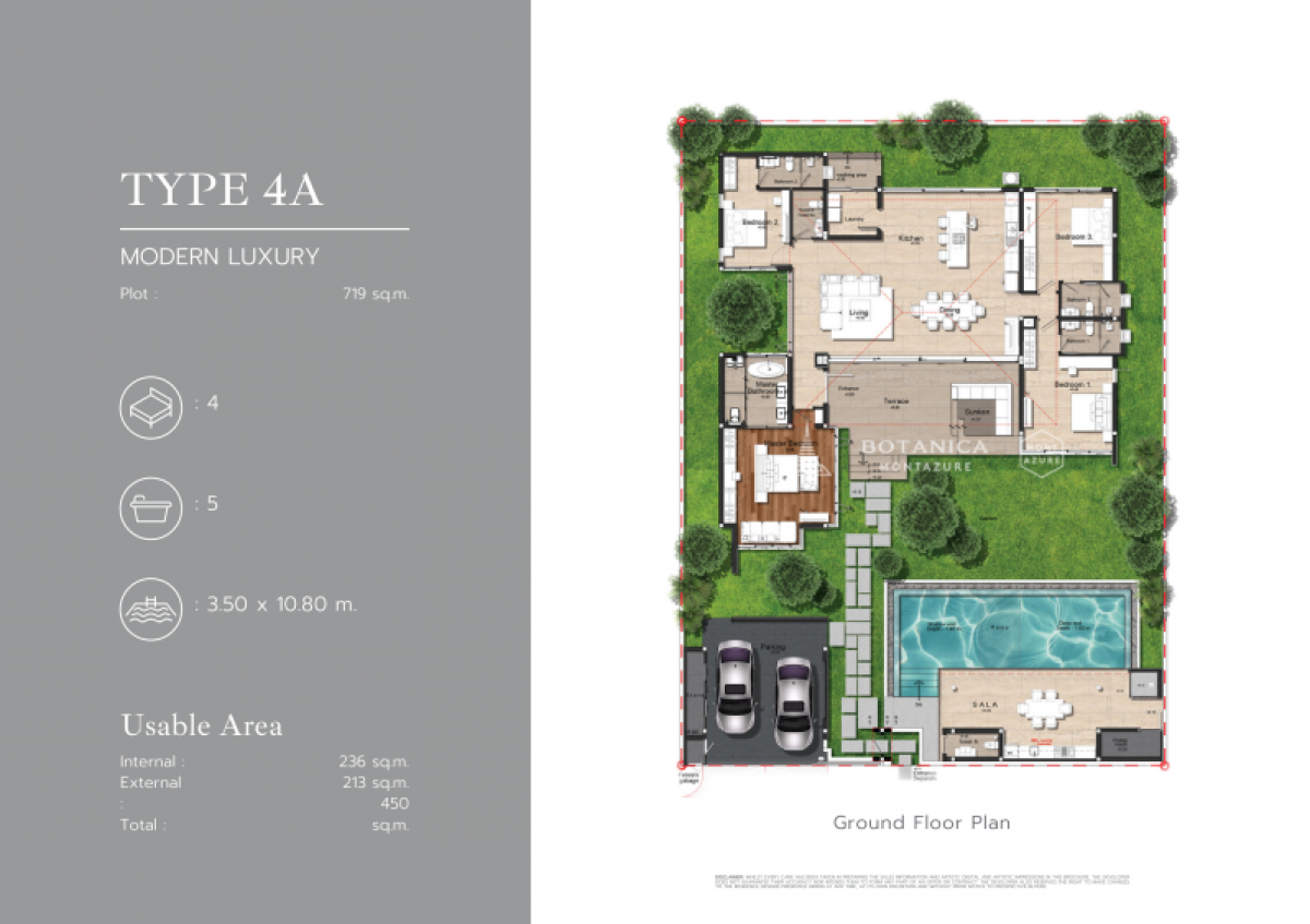 Botanica Montazure 4ANestled in a tropical oasis, these elegant single-level villas are perfect for those seeking a luxurious, stair-free living experience. Designed with a focus on tropical style and convenience, each villa boasts a well-thought-out interior that exudes comfort and sophistication.Step inside to discover a spacious and luminous open-plan living and dining area, complemented by a modern kitchen equipped with an islandbreakfast bar. The layout includes four carefully arranged bedrooms, each featuring its own ensuite bathroom. The highlight is the master suite, which offers a luxurious bathroom complete with a separate bathtub and shower. Both the master suite and the first guest bedroom open out to a generous terrace, featuring a sunken lounge area for outdoor relaxation.The outdoor space is equally impressive, with an expansive green lawn garden beckoning for outdoor activities. Bordering the lush lawn is a sparkling private swimming pool paired with a serene poolside pavilion or sala. This versatile space can be used as an outdoor lounge area, BBQ spot, or as an entertainment hub with its alfresco dining table - perfect for hosting gatherings.Situated within easy reach of the popular Kamala Beach and its vibrant town, these pool villas offer an unparalleled opportunity to embrace the luxurious tropical lifestyle. Dont miss your chance to experience the epitome of tropical living in this exclusive enclave.