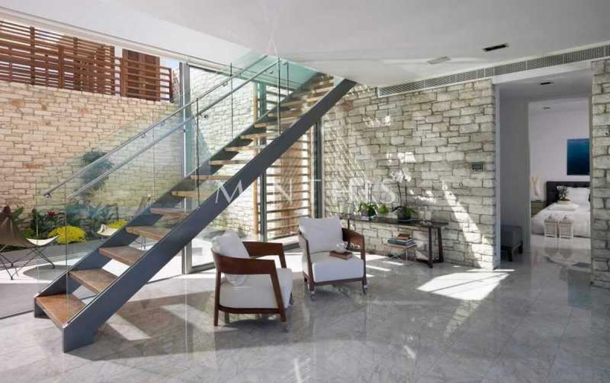 The dining area leads to a separate modern and functional italian-designed kitchen with integrated Miele appliances and an outdoor terrace equipped with a BBQ and outdoor living/ dining space. On this level there is also a bedroom suite with a private bathroom and a guest toilet.