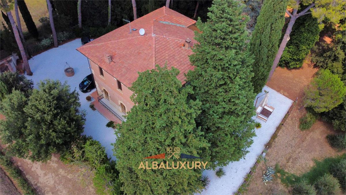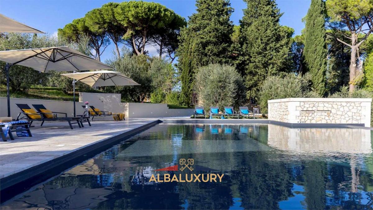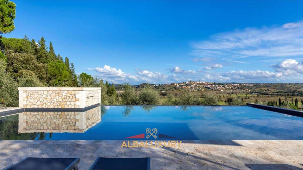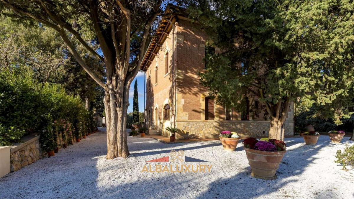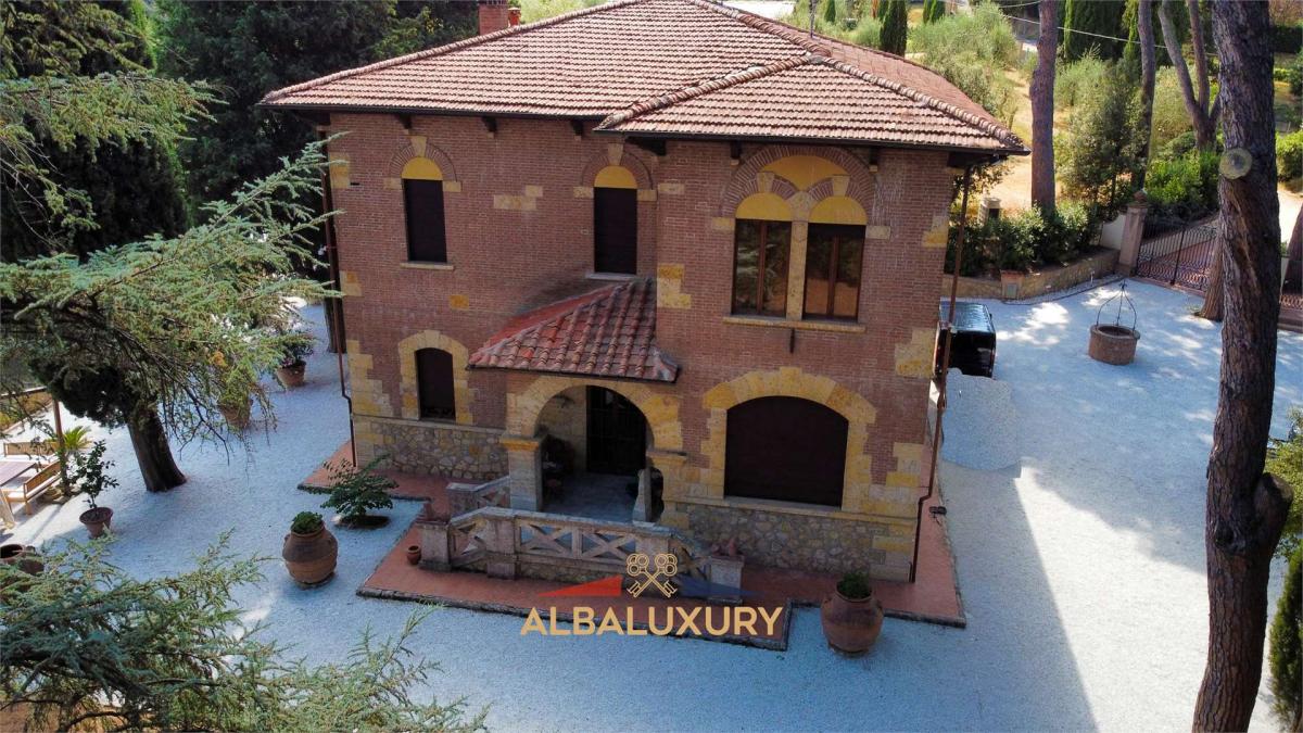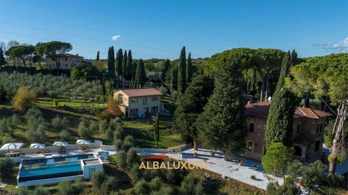 Discover a corner of luxury and tranquility with this charming villa located on the gentle hills surrounding the picturesque village of Peccioli, in the province of Pisa. This Liberty-style residence, recently renovated with a perfect blend of tradition and modernity, is the ideal retreat for those seeking an exclusive experience in the Tuscan countryside.^^Property Features:^- Villa 400 sqm spread over two levels.^- Dependance 150 sqm.^- Land 55,000 sqm with possibility to build (700 sqm for hotel accommodation, including apartments).^^Elegant Interiors: Spacious and bright rooms, with high-quality finishes in terracotta, wood, sandstone, marble, and travertine. On the ground floor, you will find a cozy living room with luxury sofas and a smart TV, a reading room with a fireplace, an open space with a dining area and a fully equipped modern kitchen, a master bedroom with an en-suite bathroom, and a guest bathroom with a washer-dryer. On the first floor, three double bedrooms with en-suite bathrooms (two with shower and bathtub, one with shower only) and a twin bedroom with an adjacent bathroom (bathtub with shower).^^Guest Dependance: The property also includes a delightful dependance, perfect for hosting friends or family with total privacy. The dependance consists of a double bedroom, a bathroom with shower, a small living room, and an independent kitchen, ensuring comfort and autonomy for guests.^^Outdoor Spaces: A park of approximately 55,000 sqm, with a garden adorned with cypress trees, maritime pines, and other trees that guarantee privacy and relaxation. There is an outdoor living area with wooden sofas and a pathway with white pebbles leading to the pool.^^Pool: Located 50 m from the villa, the 15x10 m pool is surrounded by a travertine sunbathing area with loungers and umbrellas. It features a whirlpool area, an emotional waterfall with chromotherapy, and internal lighting. The pool is salt purified and lined with emerald-colored PVC, open from the last Saturday of April until the first Saturday of October.^^Strategic Location: The villa is located a short distance from the main Tuscan tourist destinations, including Florence, Pisa, Lucca, and Volterra, as well as the beautiful beaches of the Tyrrhenian coast such as Tirrenia and Marina di Pisa. For wellness enthusiasts, the thermal pools of Casciana Terme are just 20 minutes away, while the Castelfalfi Golf Club, with its 27 holes, is 30 minutes away.^^This residence represents an extraordinary opportunity for those seeking a corner of paradise in the Tuscan countryside, perfect for moments of relaxation or for hosting special events. Contact us for further details and to discover how this villa can become your new home.,