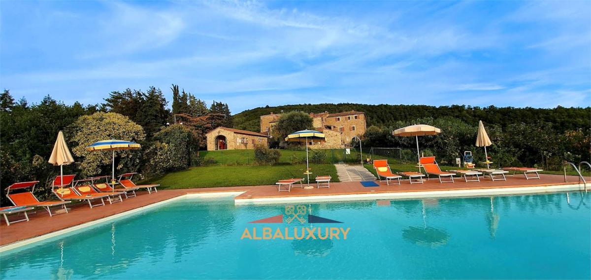Enchanting property, an agritouristic paradise nestled in the heart of Tuscany, with a vast extension of 230,000 sqm (23 ha) of pure beauty. The net covered surface area is 980 sqm.This extraordinary certified organic property is located in a privileged position, enjoying 95% sustainable energy and benefiting from a complete exemption from IMU. Your eyes will rest on the impressive 3-hectare olive grove with 300 olive trees, which annually produces 9 quintals of fine olives. But the wonders do not end there: 3 hectares of chestnut grove in production and a charming vegetable garden and orchard complete this earthly paradise. Thanks to two independent wells, drinking water and irrigation are guaranteed in a sustainable manner. The agritourism business is flourishing, with 9 rooms with private bathroom and shower (two with fireplace) and 4 delightful flats (two with fireplace) with kitchen, accommodating more than 30 guests in the main building, furnished with elegant period furniture. The restaurant with two 50-seat rooms, the reception and the cosy bar will make you feel at home.While the spacious lounge, now an art studio, conveys an artistic and relaxing atmosphere. It is the perfect place to relax after a day of sightseeing in Tuscany. The owners' residence, also located in the main building on two floors, offers a refined living area, a large living room with fireplace, kitchen and laundry bathroom with shower. Upstairs, three bedrooms and two attic bathrooms will pamper you with Tuscan warmth. Outside, the self-contained spa invites you to discover the ultimate in wellness with a Filandese sauna, a custom-made Jacuzzi with wall-mounted waterfall, a Turkish bath, an emotional shower and a glassed-in relaxation area. Indulge in chromotherapy and rejuvenating massages in a space dedicated to your harmony.^A large pine forest, a children's play area and a 16x8 metre swimming pool with infinity edges will provide you with moments of pure relaxation. The pool is heated by a solar thermal system and a wood boiler for year-round pleasure. There is an independent structure of 40 square metres near the swimming pool as well as an independent thermal room with an external wood storage shed. With a 26kw photovoltaic system, the farm generates an annual income of approximately \u20ac 13,000 until 2029. An additional incentive to enjoy the magical Tuscan atmosphere. Solar thermal system of approx. 50 sqm integrated with newly installed central heating system 2018. Private covered parking and covered customer parking guarantee comfort and safety. Tuscany is one of the best known and most appreciated places by visitors from all over the world for its typical succession of unique landscapes, characterised by gentle green hills, rich in dense woods, large expanses of vineyards and olive groves, small villages, medieval castles and wineries where you can taste the best wines in the world.^,