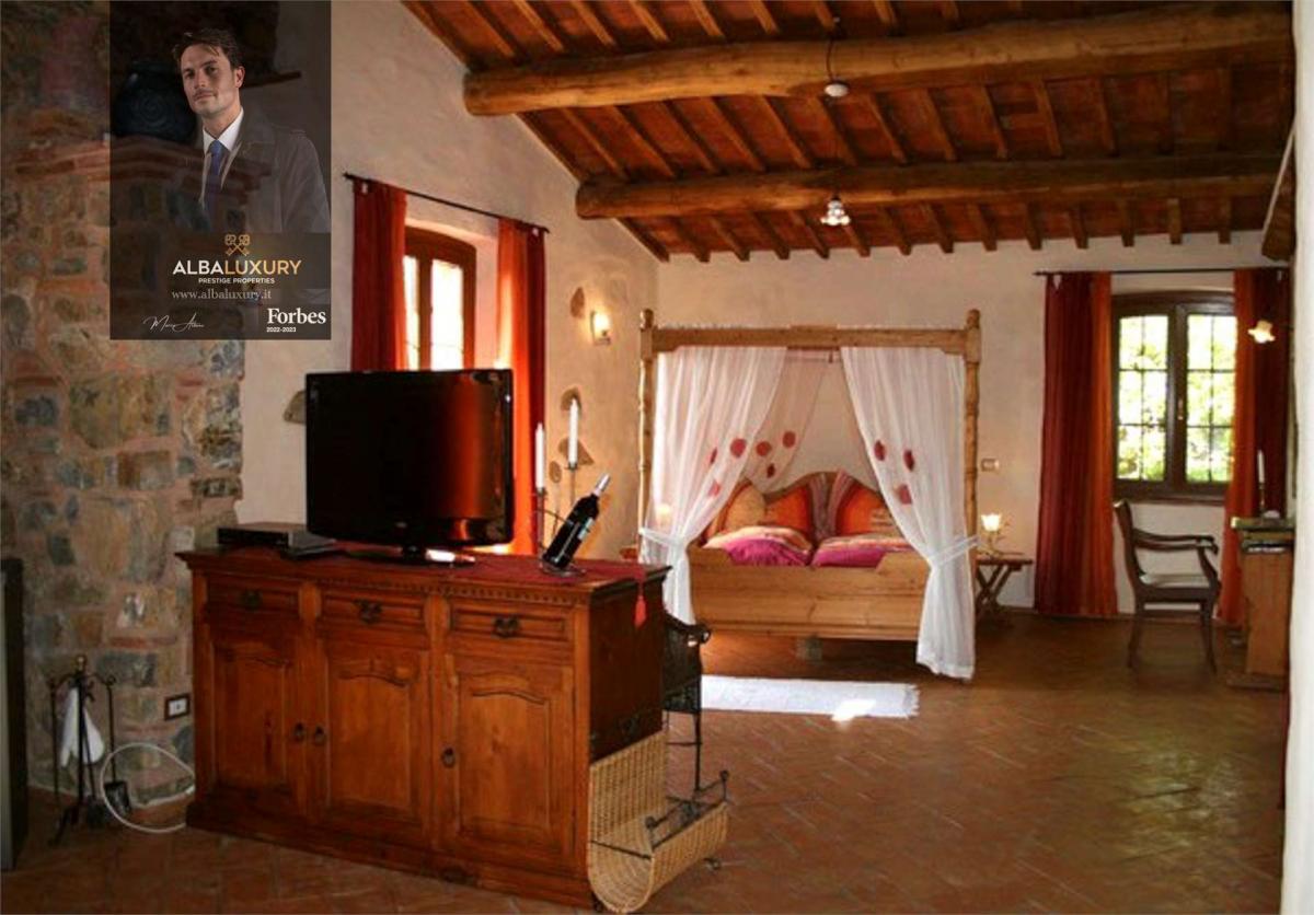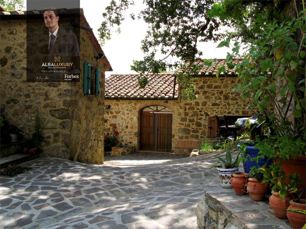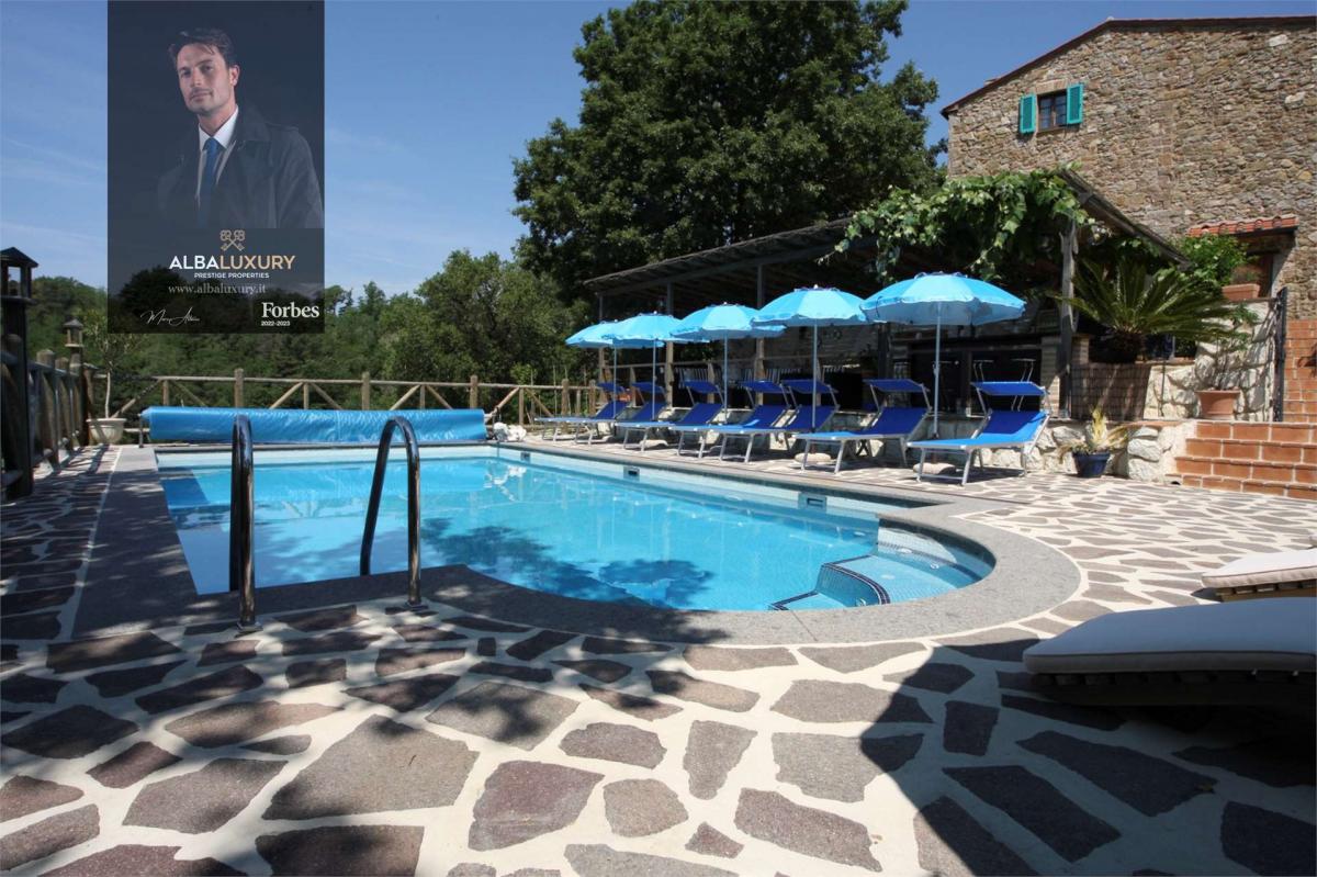 Discover the timeless elegance and incomparable serenity of this magnificent hamlet set in the idyllic hills of the Tuscan Maremma, a jewel nestled between the provinces of Grosseto and Siena, just 20 minutes from Massa Marittima. This extraordinary property, spread over a total area of 20 hectares, offers a perfect blend of lush nature and modern comforts. Immersed in a lush forest of oak and chestnut trees, the estate is a harmonious combination of privacy and ease of access, with a wonderful view of the surrounding hills and only 40 minutes from the coast of the Tyrrhenian Sea. The surrounding atmosphere exudes unparalleled peace, enhanced by the surrounding natural beauty.^Composed of four separate, fully restored buildings, the property features:^Villa 1: A rustic dwelling with three bedrooms, two bathrooms, a fully equipped kitchen and a cosy living room.^Villa 2: A charming flat with two bedrooms, a modern bathroom, a well-equipped kitchen, a spacious dining room, a bright living room and a large private terrace.^Villa 3: A luxurious loft with ample space, a lush garden and a private terrace. Downstairs: A large common room with an impressive banquet table and a beautiful kitchen. Villa 4: Agricultural annexe, with large terrace with breathtaking views. Downstairs: 2 garages^The entire estate is equipped with an exclusive swimming pool (9x5), relaxation areas, an outdoor dehors for dining, a wine cellar and a parking area that can accommodate more than 7 cars. The outdoor spaces also include 4 terraces, offering the perfect fusion of interior and exterior design.^Additional features:^Underfloor independent heating with wood boiler.^Solar panels for hot water production.^Aqueduct and spring with 10,000-litre cistern.^Rainwater collection.^Dimensions:^Living area: 1000 sqm.^18 rooms, 7 bedrooms and 7 bathrooms.^Land: 200,000 sqm.^Distances^Siena: 40 KM^Sea: 40 KM^Pisa Airport: 140 Km^Florence: 100 Km^San Galgano Abbey: 15 Km^First built-up area: 3 Km,