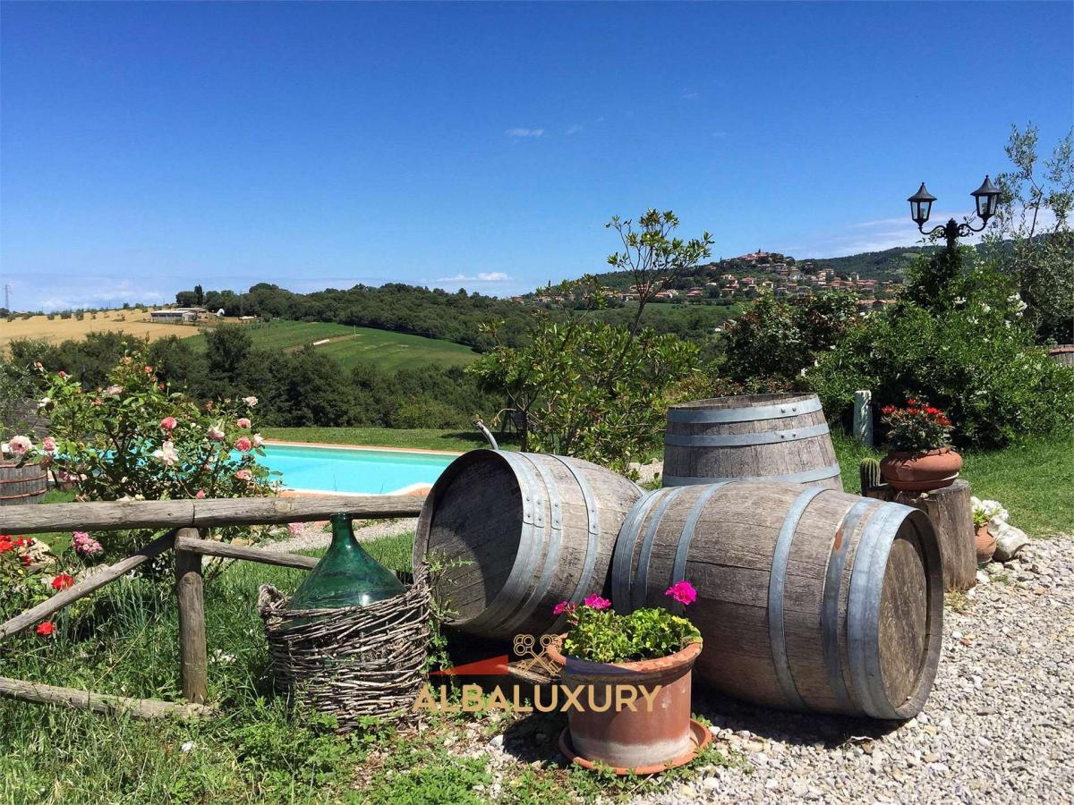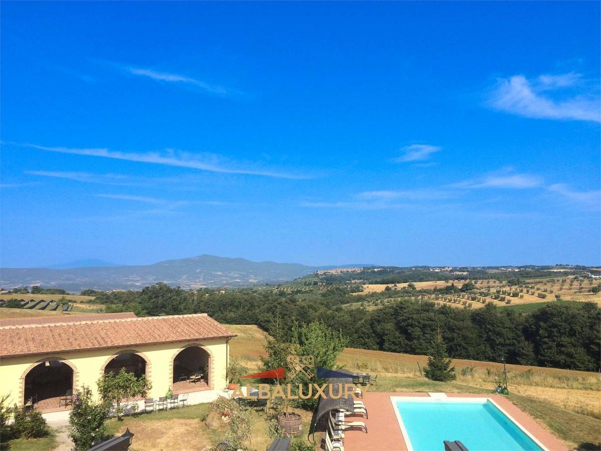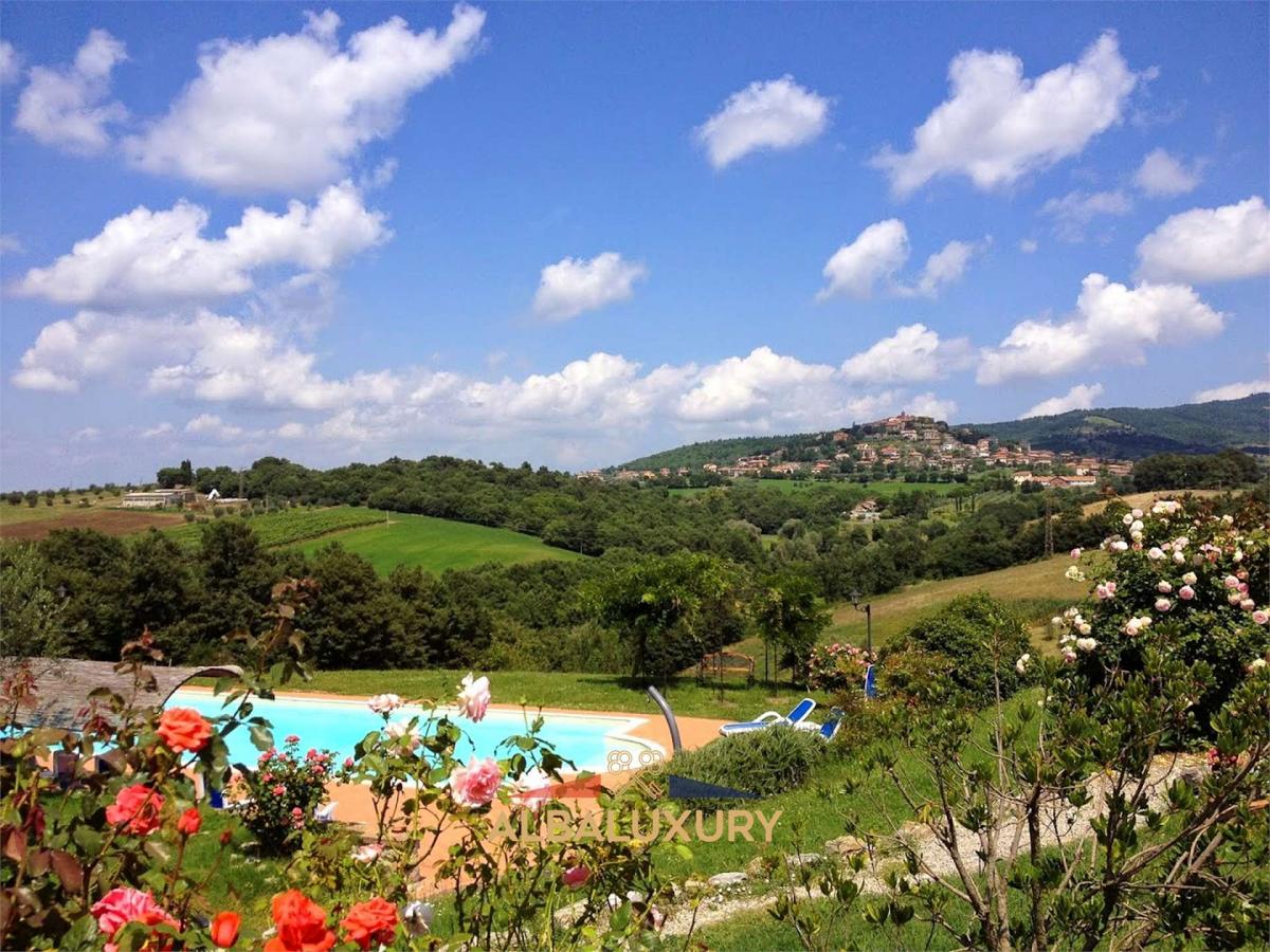 Description in English:^A splendid property in Umbria that stands on the enchanting panorama of two small medieval villages, Montegabbione and Monteleone d\u02bc Orvieto. A peaceful place amidst green hills and woods where one can relax and visit medieval villages and towns rich in art and beauty. A property restored in 2005 with a swimming pool and 13 hectares of land suitable for both private and receptive use. To date, the property is divided into:^1) Building A (on two levels): on the ground floor in the old hall we find the restaurant with fireplace, professional kitchen, reception, storeroom, pantry, laundry and bathrooms for guests and staff. On the upper floor we find the master flat and one of the five flats (two-roomed) intended for agritourism. The master flat consists of 2 bedrooms, living room, kitchen and two bathrooms. ^2) Building B of approximately 200 square metres (on two levels): in this section we find 4 two-room flats (of which 3 on the ground floor) each with bedroom, living room and bathroom. The rooms have an independent entrance and private garden areas^3) Additional outbuildings: there is a former barn renovated in 2013, an open but covered room now used as a relaxation room. Also present are a warehouse, old stable, woodshed, storage room, garage. The property is completed by a beautiful panoramic swimming pool (6 x 14 metres) and land of about 13 hectares, including 4,000 square metres of garden, barley and alfalfa crops, as well as a vineyard of about 1 hectare of Pinot Noir and 140 olive trees. Umbria is an Italian region bordering Tuscany, Lazio and Marche. Often referred to as the green heart of the country, the region is famous for its medieval hilltop towns, dense forests and local cuisine, especially wine and truffles.,