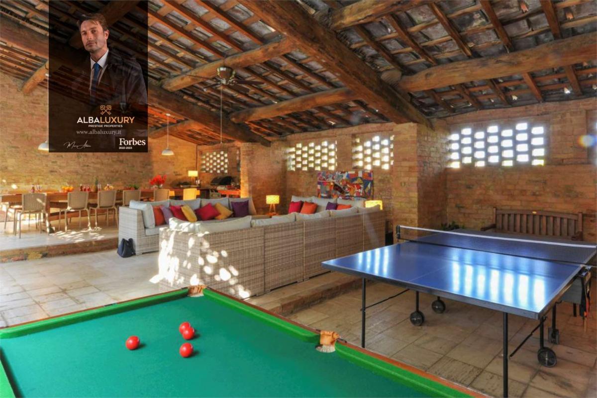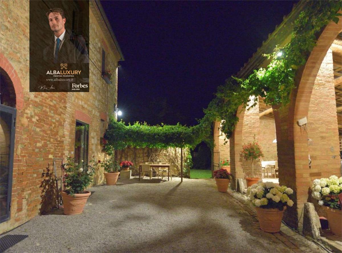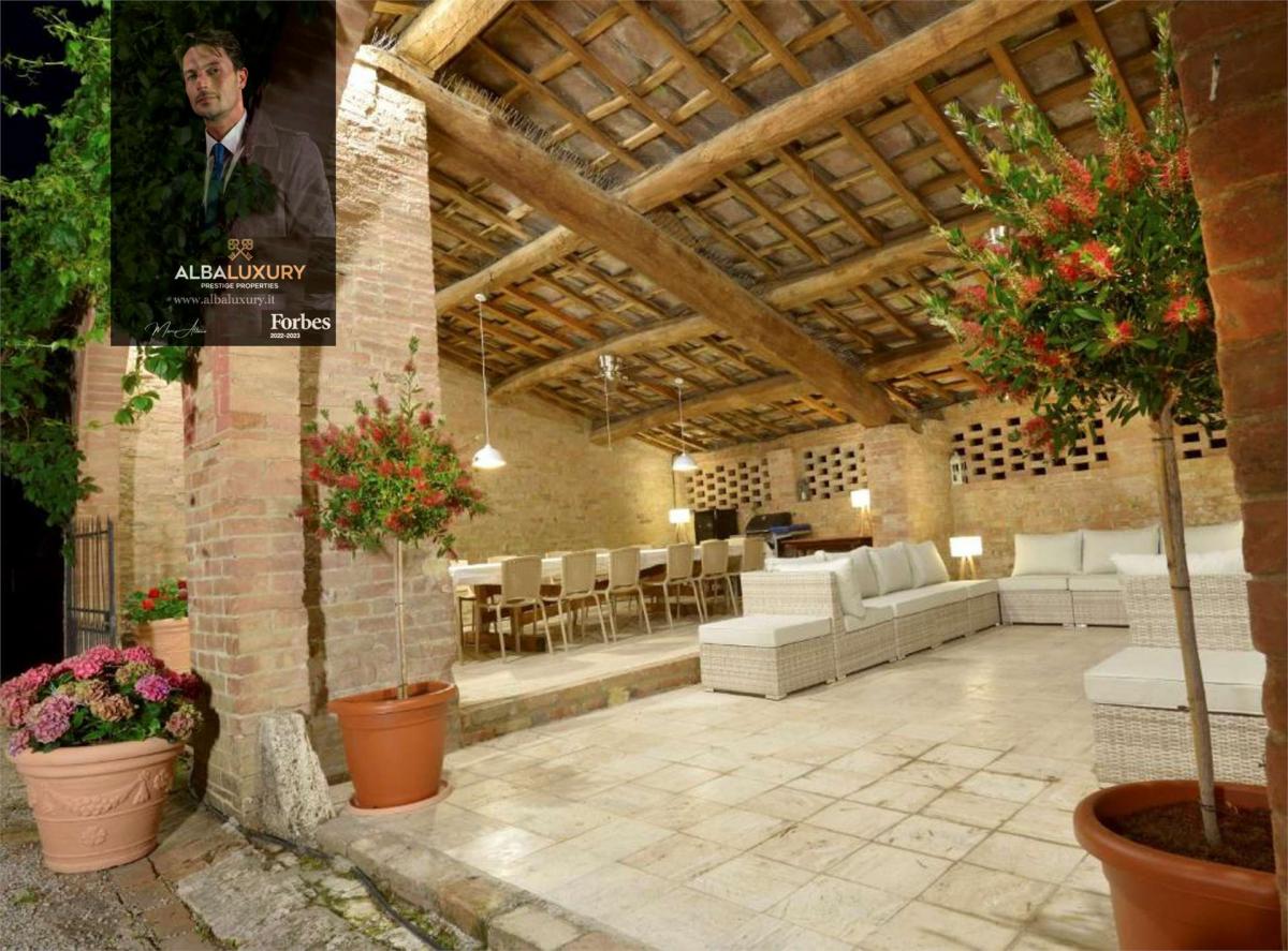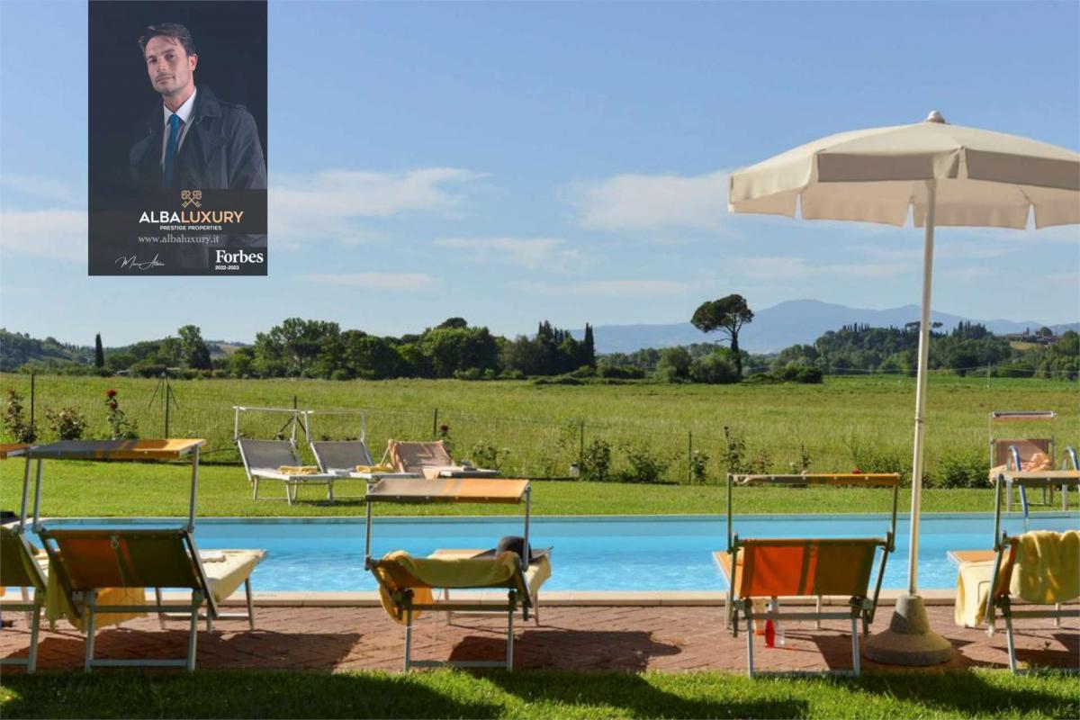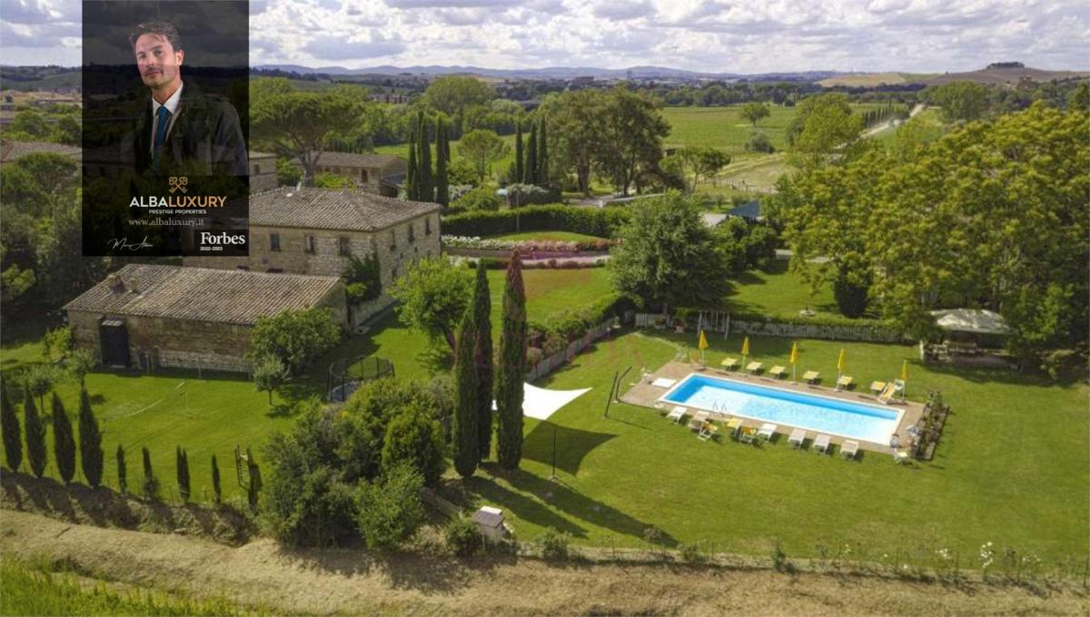 This charming estate, located a short distance from Siena and nestled amidst the fascinating Crete Senesi, offers a unique experience of charm and serenity. Consisting of a main farmhouse and a picturesque outbuilding, both dating back to the 19th century and renovated with attention to detail, the property covers an area of approximately 810 sqm.^The main farmhouse, on two levels, welcomes guests with a spacious entrance hall converted from an old stable, introducing them to a cosy and authentic ambience.^The double bedrooms, some with en-suite bathrooms, are distributed on the ground floor, some with small kitchenettes for a touch of practicality.^The first floor houses the master area with two bedrooms, two bathrooms, a charming living room characterised by high ceilings and a fireplace, and an eat-in kitchen.^The annexe, with living room and kitchenette, master bedroom with en-suite bathroom and a further bathroom, completes the cosy atmosphere of the property.^Surrounded by an enclosed garden of approximately 4,000 square metres, the estate boasts the presence of imposing cypresses and trees providing shade and coolness during the hot summer days.^The heated 12 x 6 m swimming pool, disinfected with chlorine, offers a relaxing retreat surrounded by nature.^Beyond the garden, there are approximately 4 hectares of land cultivated with chicory and a small truffle farm, ideal for organic farming.A spacious covered veranda adjacent to the main house, with an outdoor bathroom and a wood-burning room with pizza oven, provides a perfect place to socialise and enjoy the summer weather.^The parking area, covered for maximum tranquillity, is located beyond the garden.^The renovation, completed in the late 1990s, has skilfully integrated traditional materials with modern solutions, maintaining the authentic Tuscan character.^The external stone fa\u00e7ade is a distinctive feature that captures the typical style of the region.^The photovoltaic system with storage batteries and the recharging station for electric vehicles testify to the focus on energy efficiency.^The option of continuing the agritourism business, with over 25 years of success, presents itself as an attractive prospect.^The property can also be adapted to serve as a private residence, offering a lifestyle away from the hustle and bustle of the city.^^^Located in the renowned Crete Senesi area, the property offers characteristic landscapes and authentic tranquillity.^The proximity to Siena makes the location ideal for those who wish to combine the beauty of the Tuscan countryside with the convenience of city life.,