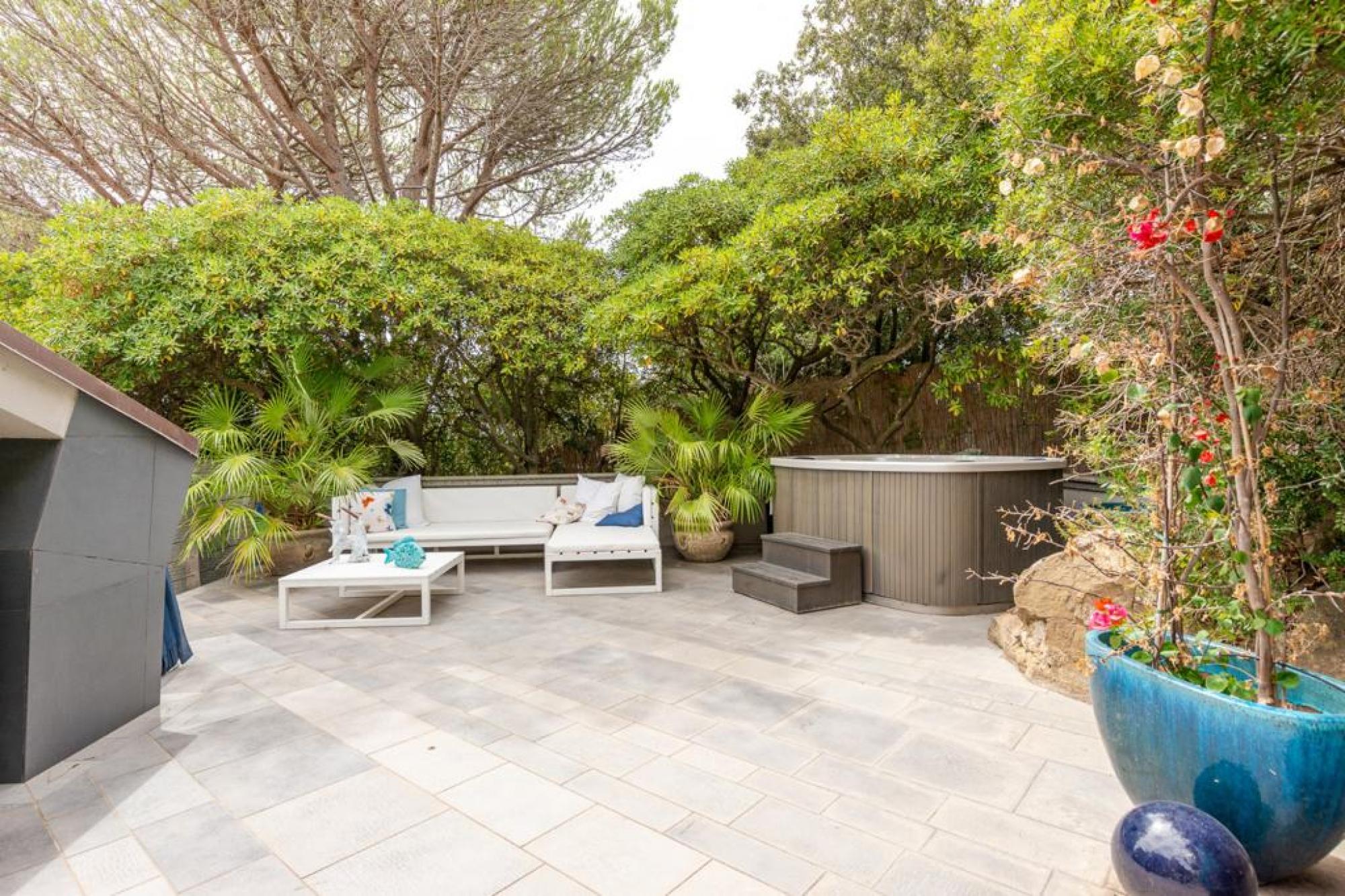 - The dining area transitions into a panoramic terrace fully equipped for outdoor living, featuring a luxury jacuzzi and a spacious veranda.