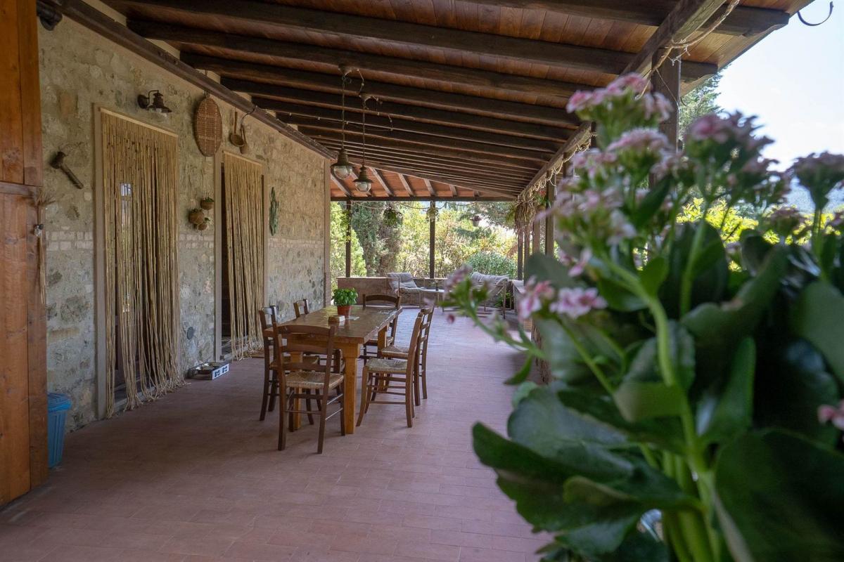 The property is surrounded by approximately 3,000 sqm of fenced garden, which includes a 10x5 meter swimming pool with a solarium and a barbecue area. The house also features an approximately 60 sqm covered outdoor space. Access to the property is through an electric gate. The farmhouse is surrounded by nature, with spectacular views of the surrounding hills, creating an atmosphere of peace and tranquility. The swimming pool is perfect for enjoying the panorama, and the garden is an ideal place to relax or enjoy moments of conviviality.