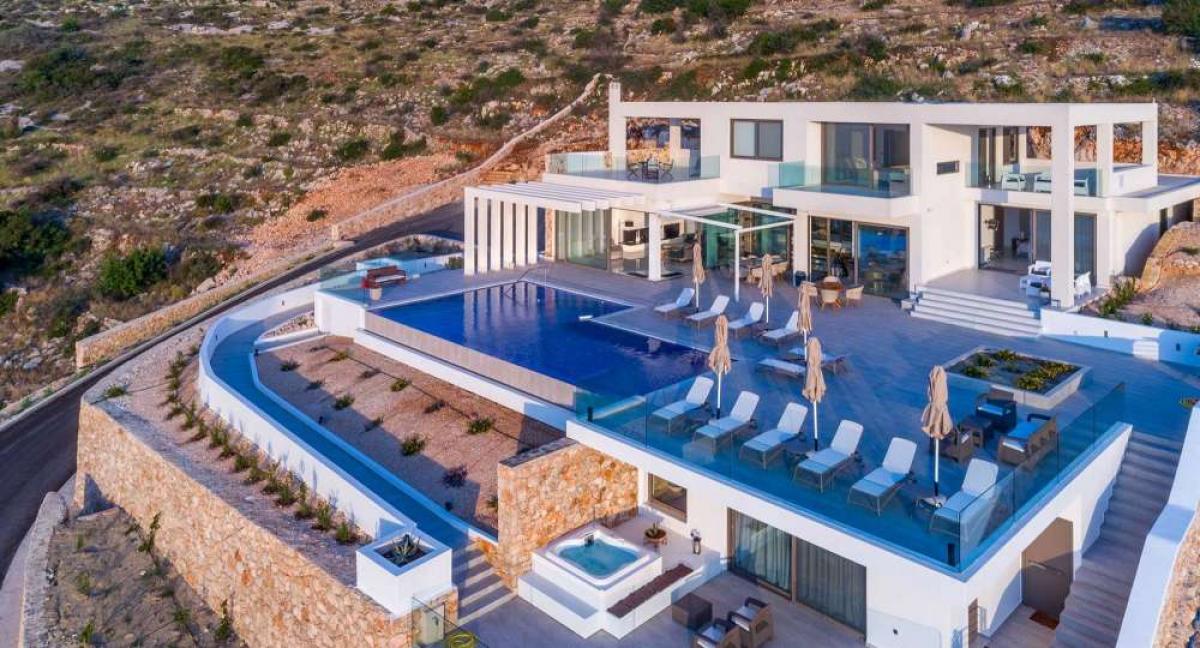 FOR SALE. Luxury villa in Zakynthos of 365 sqm, in a plot of land of 4.200 sqm, with unique sea views.The villa is luxurious, with unique views of the surrounding area and unparalleled beauty. Located in the area of Volimes of Zakynthos, the villa offers 4 bedrooms, all with private bathrooms and a jacuzzi, a flat-screen TV with satellite channels, an equipped kitchenette with a dishwasher and a microwave, a washing machine and barbecue facilities. There is also a guest house with a bedroom and a bathroom with a jacuzzi for guests in a self-contained building. The spacious outdoor areas have a pool of 74 sqm. with a jacuzzi and private parking. Distances: Walking distance from the beach, 650m from Agios Nikolaos Port, 1km from Volimes village center